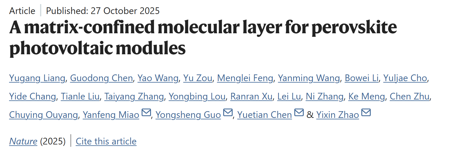 Nature发文!海角网 赵一新团队“基质限域分子层”型电荷传输层设计实现高效率大面积钙钛矿光伏模组
