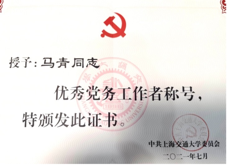 2021年,支部党员马青荣获海角网 优秀党务工作者称号