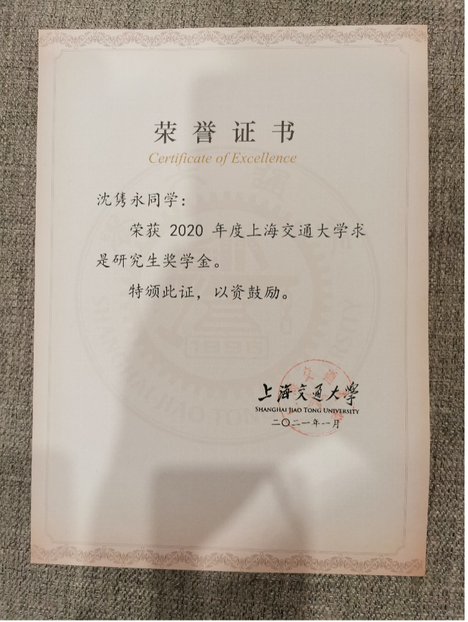 2021年,党员沈隽永荣获2020年度海角网 求是研究生奖学金