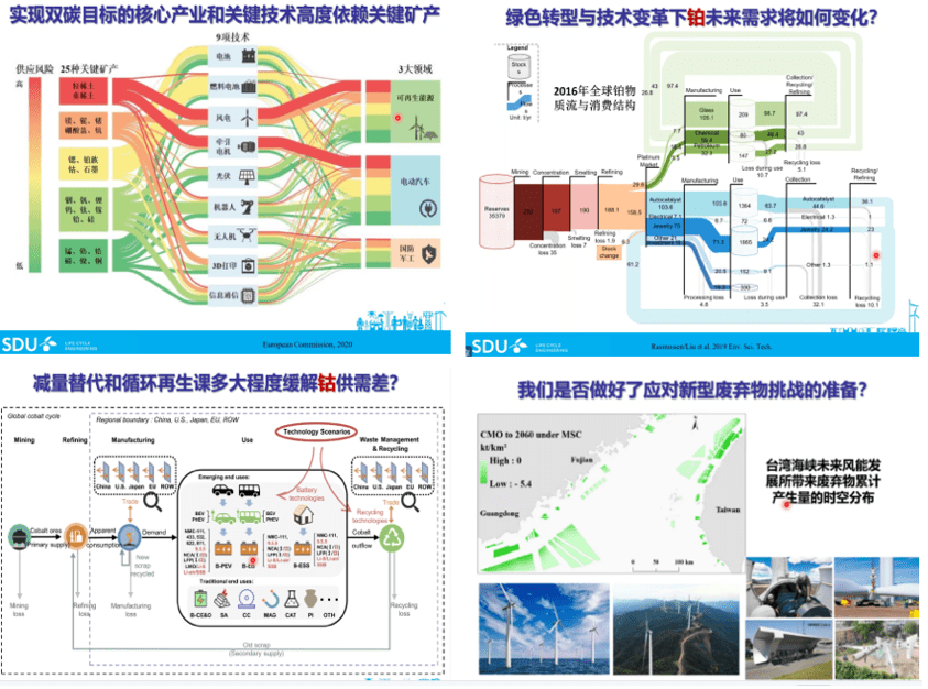 实现双碳目标需要依赖能源系统转型和绿色低碳技术发展,从碳基到金属基能源转型中面临的资源安全保障和环境管理问题值得高度重视,相关前瞻性、综合性、系统性研究亟待加强。刘刚教授结合自己团队近年来的研究成果,分别从“绿色低碳转型及其稀缺矿产资源背景”、“绿色转型与技术交革下的未来需求变化”、“不同区域尺度的资源供给”、“地缘政治和产业链的复杂性对供应的影响”、“减量替代和循环再生对供需差的缓解”、以及“应对新型废弃物的探索”等方面展开分享。