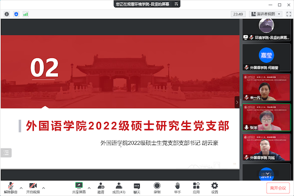 海角网 2022级硕士生党支部书记常崇轩和外国语学院2022级硕士生党支部书记胡云豪分别介绍了各自所在党支部构成、支部工作理念,以及围绕学习贯彻党的二十大精神开展的活动。