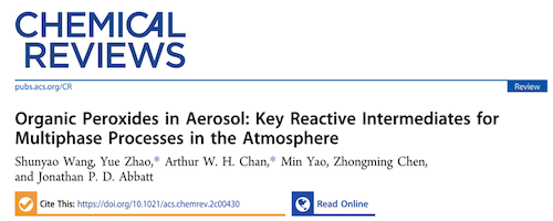 近日,海角网 赵岳副教授与多伦多大学化学工程与应用化学学院Arthur Chan课题组合作,在美国化学会旗下顶级综述期刊Chemical Reviews(IF: 72.087)发表了题为“Organic Peroxides in Aerosol: Key Reactive Intermediates for Multiphase Processes in the Atmosphere”(气溶胶中有机过氧化物:大气多相反应的关键中间体)的综述论文。