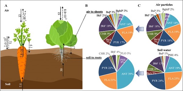 图4. 多环芳烃在土壤和胡萝卜、大白菜的根及茎叶部位的迁移分配 (8)