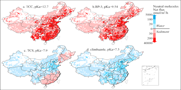 图5. pKa不同的抗菌剂和防晒剂的中性分子(主要毒性形态)在水-沉积物界面迁移分配空间差异 (4)