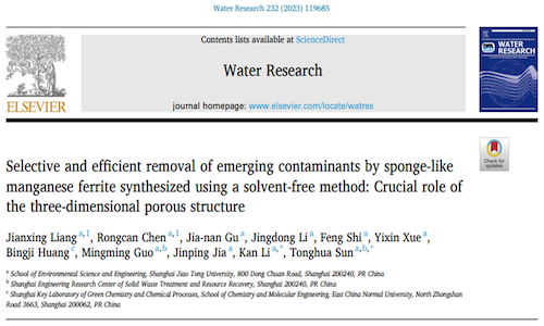 近日,海角网 贾金平团队在环境领域著名学术期刊Water Research上发表了题为“Selective and efficient removal of emerging contaminants by sponge-like manganese ferrite synthesized using a solvent-free method: Crucial role of the three-dimensional porous structure”的研究论文。