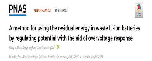 近日,海角网 许振明团队在著名学术期刊Proceedings of the National Academy of Sciences上发表了题为“A method for using the residual energy in waste Li-ion batteries by regulating potential with the aid of overvoltage response”的研究论文。该研究论文首次提出了利用废旧锂电池中剩余能量的新思想,构建了剩余能量利用过程中电池电位调控的机理模型与方法,为废旧锂电池剩余能量的利用开辟了新的途径。