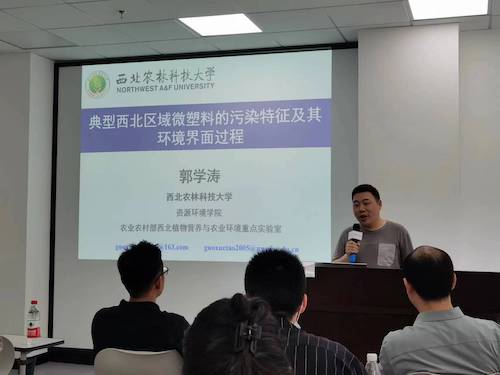 在讨论环节,与会师生就“土壤中不同有机质含量及老化方式导致的不同老化机制”“微塑料的光降解路径”以及“模拟大气沉降微塑料暴露浓度的选定”等问题与郭学涛教授展开了热烈讨论。