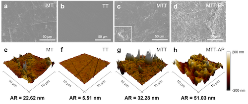 图1 (a-c, e-g)经过140天老化后的原始PE薄膜和(d, h)环境老化PE薄膜的表面微观形貌。机械力处理组(Mechanical treatment, MT),热处理组(Thermal treatment, TT),机械-热处理组(Mechanical-thermal treatment, MTT)和环境老化塑料的机械-热处理组(Mechanical-thermal treatment with aged plastics, MTT-AP)