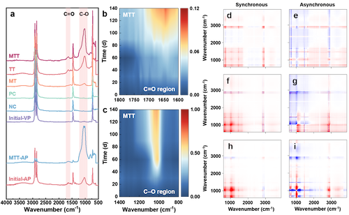 图2 (a)不同老化条件下PE薄膜的红外光谱图;在机械-热处理组老化140天后原始PE薄膜(b)C=O和(c)C–O基团分布范围的热图;(d,e)机械力处理组、(f,g)热处理组和(h,i)机械-热处理组中原始PE薄膜的红外光谱经过2D-COS分析后的同步图和异步图