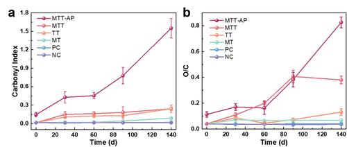 图3 (a)羰基指数和(b)O/C随老化时间的变化趋势