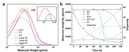 图4 (a)原始PE塑料(实线)和环境老化塑料(虚线)经过140天老化后的分子量分布;(b)塑料分子量(实心点)和分散度(空心点)随时间变化的趋势
