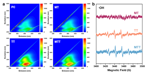 老化过程中,塑料的亲水性增加使得有机物更容易附着在塑料表面,填埋场中丰富的DOM可能会通过高共轭作用与塑料相互作用形成塑料-DOM混合体系。另一方面,高温会导致塑料内含DOM释放到周围环境中,从而使得荧光强度高于对照组和单独机械力处理组。同时,在高温存在的情况下检测到·OH,推测高温能够促使DOM产生·OH从而加速塑料的老化。
