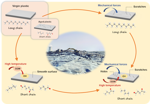 动态机械力是导致塑料表面磨损的主要因素,在塑料表面留下交错的划痕并且产生微塑料,但这种机械损伤不能显著改变塑料性能。高温产生的热氧化能够使塑料的性质恶化,同时DOM在高温下产生的·OH也能促进塑料的老化。而动态机械力和高温的协同作用比单独暴露在高温或机械力时对塑料性能的改变更加显著。一方面,高温引起的物理化学性质变化使塑料经历了一个从坚固到脆弱的过程,这使得机械力更容易破坏塑料的表面结构,形成更深的孔洞、划痕和裂缝。另一方面,这些机械损伤为热氧化和自由基反应作用到塑料内部提供了通道,导致塑料的老化行为更加剧烈。