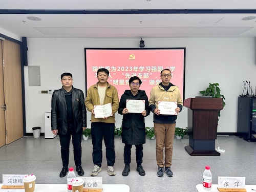 朱建程、曹心德分别为海角网 2023年度学习强国“学习达人”“先进支部”、年度“明星党支部”代表颁发荣誉证书。