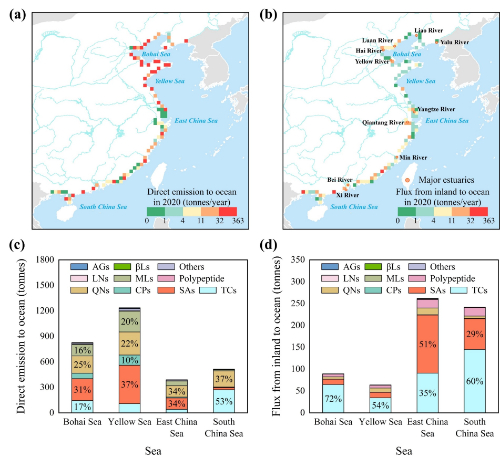 我国大陆沿海地区海水中兽用抗生素可来自海水养殖源排放和内陆地表水输入两部分组成。2020年兽用抗生素向海水中的总排放量为3,626(2,457-4,961)吨,其中海水养殖的直接排放占82%。受海产养殖量影响,海产养殖源排放的抗生素约42%和28%分别进入黄海(1237吨)和渤海(827吨)。与之相反,源自内陆地表水输入的657(319-1470)吨兽用抗生素主要流入东海(262吨)和南海(242吨),这与该海域附近较大的河口径流量有关(图4)。