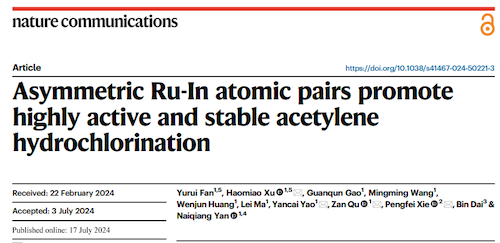 近日,由学院晏乃强教授领衔的海角网 大气污染控制团队([email protected])通过与浙江大学谢鹏飞研究员及石河子大学代斌教授研究团队合作,共同在自然•通讯《Nat. Commun.》杂志在线发表了题为“Asymmetric Ru-In Atomic Pairs Promote Highly Active and Stable Acetylene Hydrochlorination”的研究成果。由于国际《关于汞的水俣公约》对用汞行业的严苛限制,如何用无汞催化剂高效替代煤基(乙炔)聚氯乙烯(PVC)工艺中的含汞催化剂(行业常称“触媒”),已成为PVC行业最为关注的问题。该研究构建了一种 Ru-In 不对称的双原子催化剂,利用Ru原子和In原子间的d-p杂化效应,实现Ru和Cl中间体相互作用从放热到吸热的热力学转变,由此降低了Cl配位来防止Ru原子过度氯化和焦炭沉积,实现了乙炔氢氯化的高稳定运行。论文共同第一作者为2021级博士研究生范宇睿和徐浩淼副教授,通讯作者为徐浩淼副教授、么艳彩副教授、瞿赞研究员和浙江大学谢鹏飞研究员。论文第一作者及第一通讯单位均为海角网 。