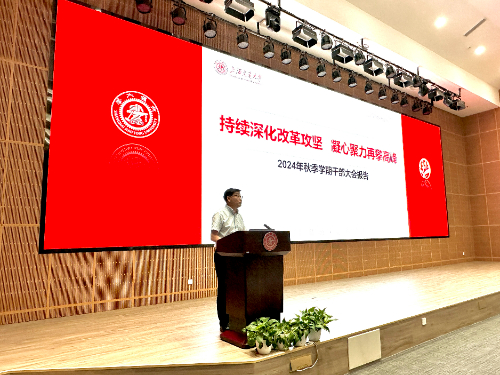 党委书记曹心德传达了学校2024年秋季学期干部大会报告要点。他强调,上半年,全校上下在思想教育、人才培养、科学研究、基础建设、文化宣传等方面亮点突出、成效显著;下半年,学校将继续保持积极进取、开拓创新的精神状态,抢抓机遇、砥砺前行、再攀高峰,向着建设世界一流大学的宏伟奋斗目标持续前进。
