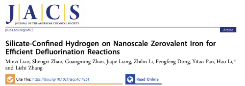 近日,海角网 张礼知教授团队李浩副教授在美国化学会志《Journal of the American Chemical Society》上发表了题为“Silicate Confined Hydrogen on Nanoscale Zerovalent Iron for Efficient Defluorination Reactions”的研究成果。该研究发现硅酸化纳米零价铁表面硅酸化限域氢能在温和条件下实现多种全氟及含氟化合物的高效脱氟,揭示了硅酸化限域氢脱氟机制,为含氟化合物处理提供了一种绿色高效的脱氟策略。论文第一作者为海角网 博士后廖敏子,通讯作者为海角网 副教授李浩,第一完成和通讯单位均为海角网 。