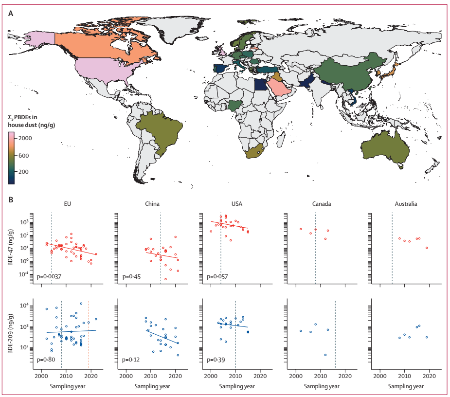 近日,朱樱副教授团队在环境与健康领域著名期刊《柳叶刀-星球健康》The Lancet Planetary Health 上发表了题为“Effects of global treaties on commercial chemicals widely used as additives: a meta-analysis of historical measurements of polybrominated diphenyl ethers”的研究论文。该研究以一类典型持久性有机污染物多溴二苯醚(PBDEs)为例,通过对其全球外暴露及内暴露数据进行荟萃分析,发现国际禁令在降低化学品人体暴露方面的效果“延迟而缓慢”。其主要原因为在用产品的持续释放及化学品的生物累积性。据此,研究指出,化学品管理模式应从末端治理转向更严格的源头预防。论文第一作者为海角网 2023级博士研究生钟光斌,通讯作者为朱樱副教授。论文第一作者及第一通讯单位均为海角网 。