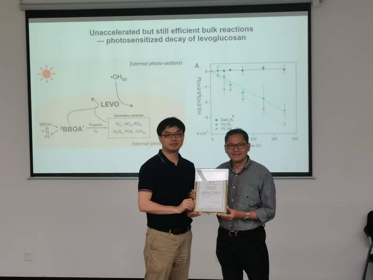 Chak K. Chan教授首先介绍了阿卜杜拉国王科技大学的办学规模、学科设置,以及能源与海角网 (SEE)的主要学科方向和师资力量。随后,他从大气光敏物质三重激发态的产生与归趋出发,介绍了其团队在生物质燃烧有机气溶胶(BBOA)非均相光敏化反应研究方面的最新进展。Chak K. Chan教授团队结合实验和模型模拟,定量表征了典型污染物二氧化硫(SO2)在BBOA中通过非均相光敏化反应氧化生成硫酸盐的过程,揭示了BBOA中硫酸盐的非均相生成机制,明晰了该途径对不同环境大气中硫酸盐气溶胶形成的贡献。这些研究为理解大气硫酸盐气溶胶形成的复杂化学机制提供了新的视角。