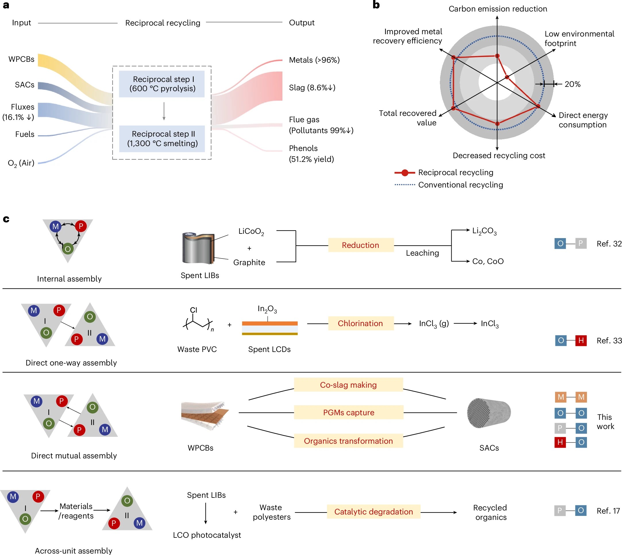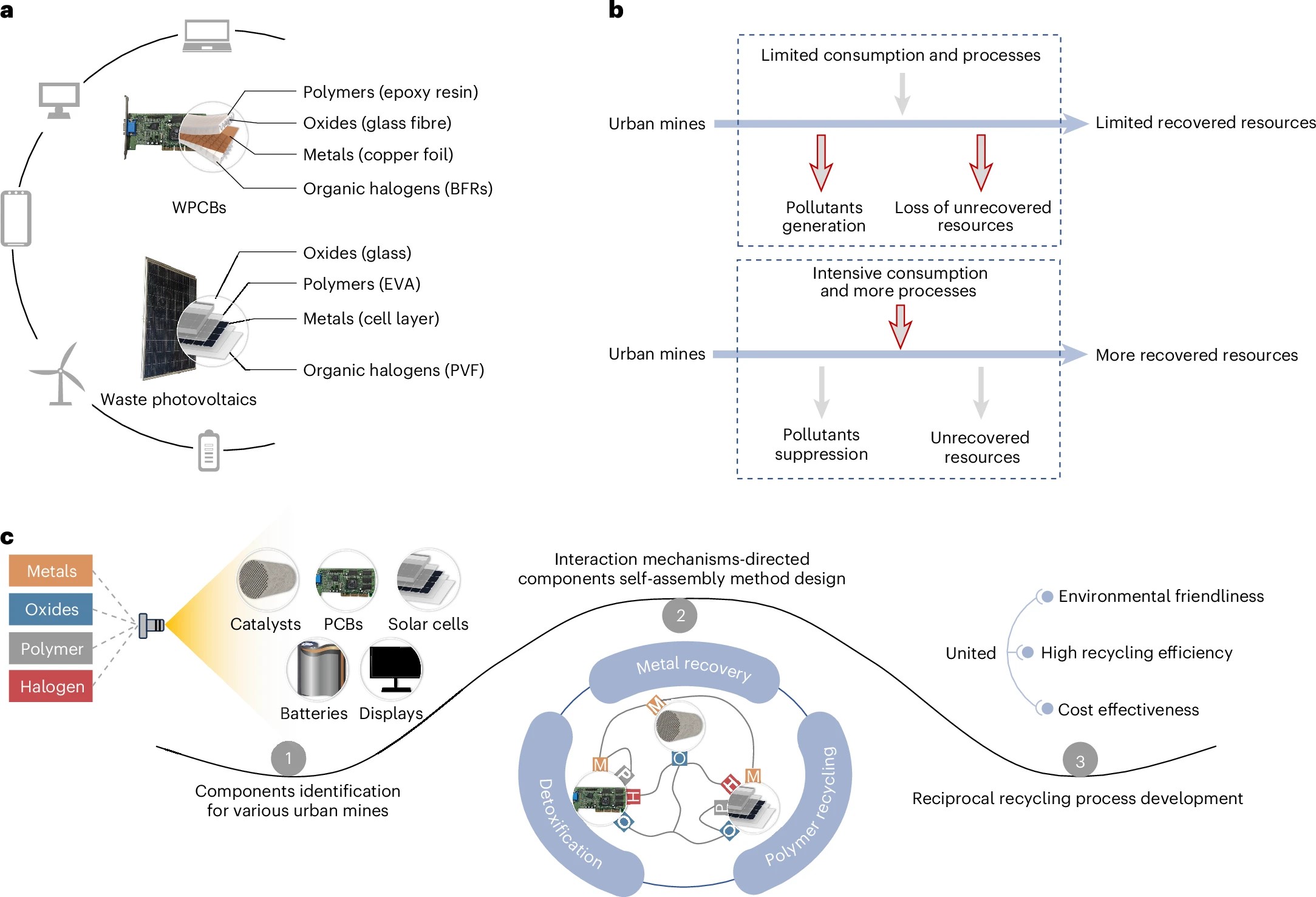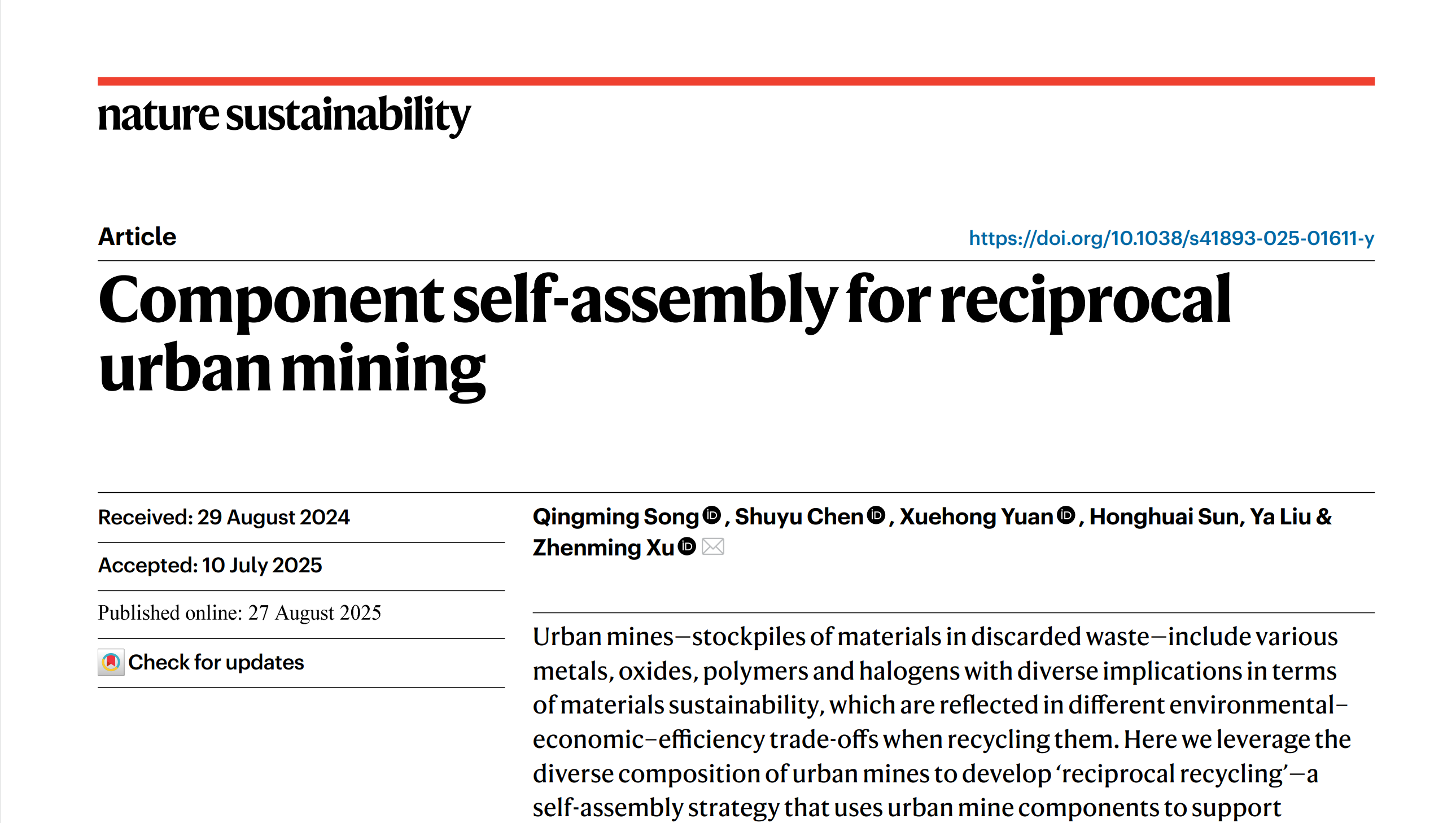 近日,海角网 许振明教授团队在《Nature Sustainability》在线发表了题为“Component self-assembly for reciprocal urban mining”的研究成果。该研究提出了一种城市矿产组分自组装互惠回收策略,利用其组分多样性特征实现城市矿产的可持续互惠互助回收。海角网 博士后宋庆明为论文第一作者,许振明教授为论文唯一通讯作者。本工作受到国家自然科学基金资助。