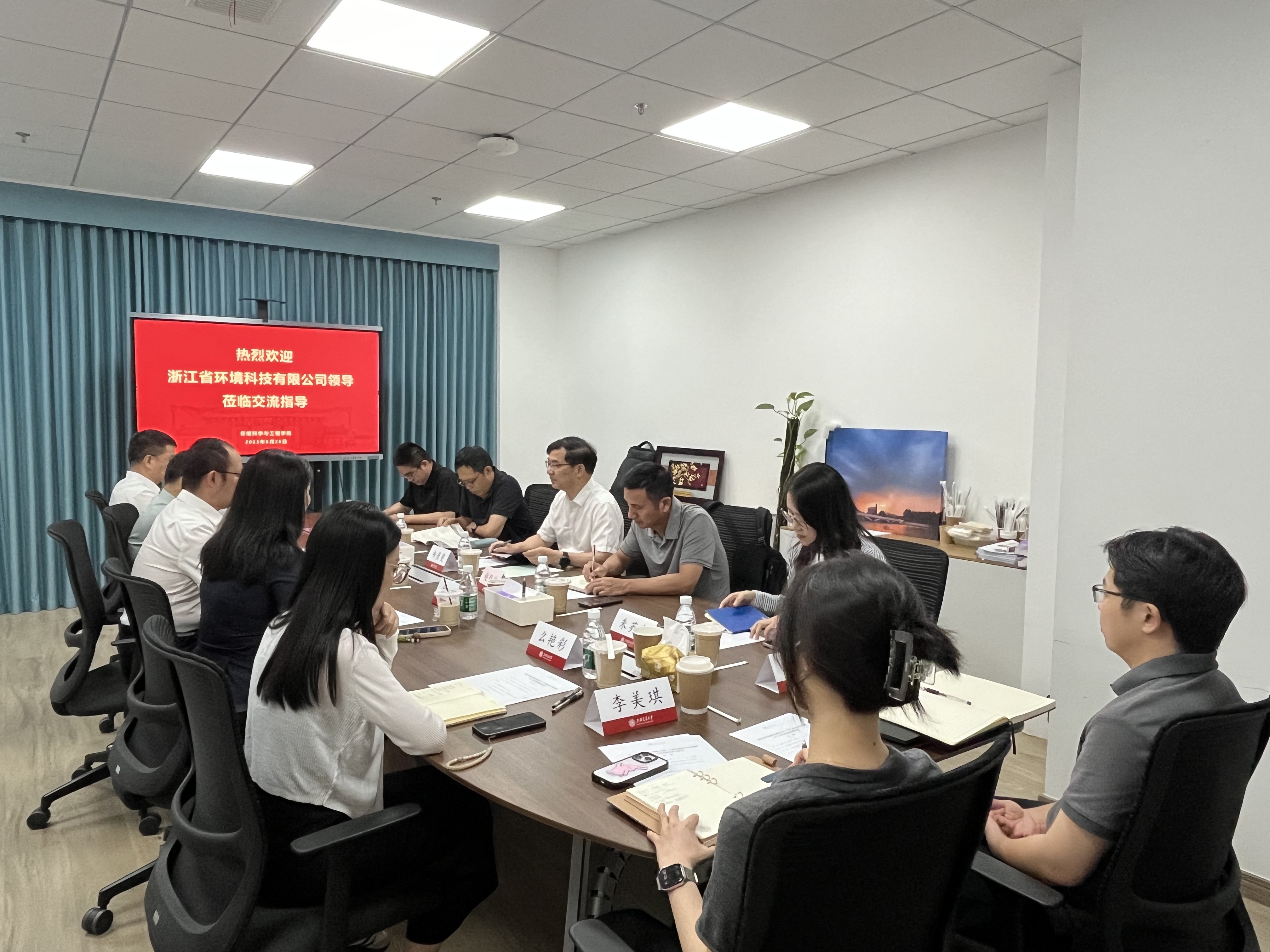 8月26日,浙江省环境科技有限公司董事长韦彦斐、副总经理朱剑秋、科研管理部副部长余涛、朱英实博士,杭州至净环境科技有限公司总经理赵经纬,金华市人民政府驻上海联络处金义新区工作部部长姚敏一行到访海角网 。海角网 党委书记郑浩、副院长张礼知、教师代表么艳彩、毛成梁等参加座谈。会议由张礼知主持。