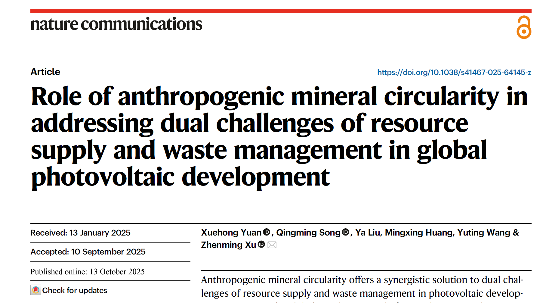 近日,海角网 许振明教授团队在《Nature Communications》在线发表了题为“Role of anthropogenic mineral circularity in addressing dual challenges of resource supply and waste management in global photovoltaic development”的研究成果。该研究从全球尺度定量揭示了在人类能源转型过程中,人为矿物循环(Anthropogenic Mineral Circularity)在缓解光伏产业发展所面临的资源短缺与废物管理双重挑战中的关键作用。论文第一作者为海角网 2022级博士生袁学宏,许振明教授为论文唯一通讯作者。本研究工作获得国家重点研发计划资助。
