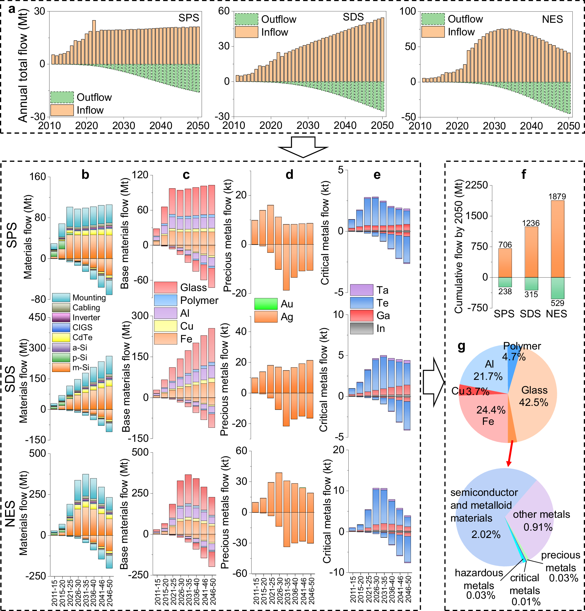 随着全球光伏装机容量的迅猛增长,光伏能源正逐渐成为未来能源体系的重要支柱。然而,这一快速扩张也带来了两大挑战:一是对原生矿产资源的需求不断攀升,威胁材料供应的可持续性;二是退役光伏系统废弃物量的急剧增加,可能引发潜在的环境风险。人为矿物循环(即从废弃物中回收并再利用矿物资源)被认为是协同解决资源供应与废物管理问题的关键途径。为此,该研究构建了一个定制化模型框架,系统评估了在既定政策情景(SPS)、可持续发展情景(SDS)和净零排放情景(NES)三种不同能源发展路径下,五种主流光伏技术(单晶硅、多晶硅、非晶硅、碲化镉、铜铟镓硒)所涉及的23种材料的二次供应潜力,并进一步量化了二次材料供应在缓解金属关键性、提升经济潜力以及减少碳排放方面的作用。研究为光伏产业的可持续发展和全球能源转型提供了科学依据。