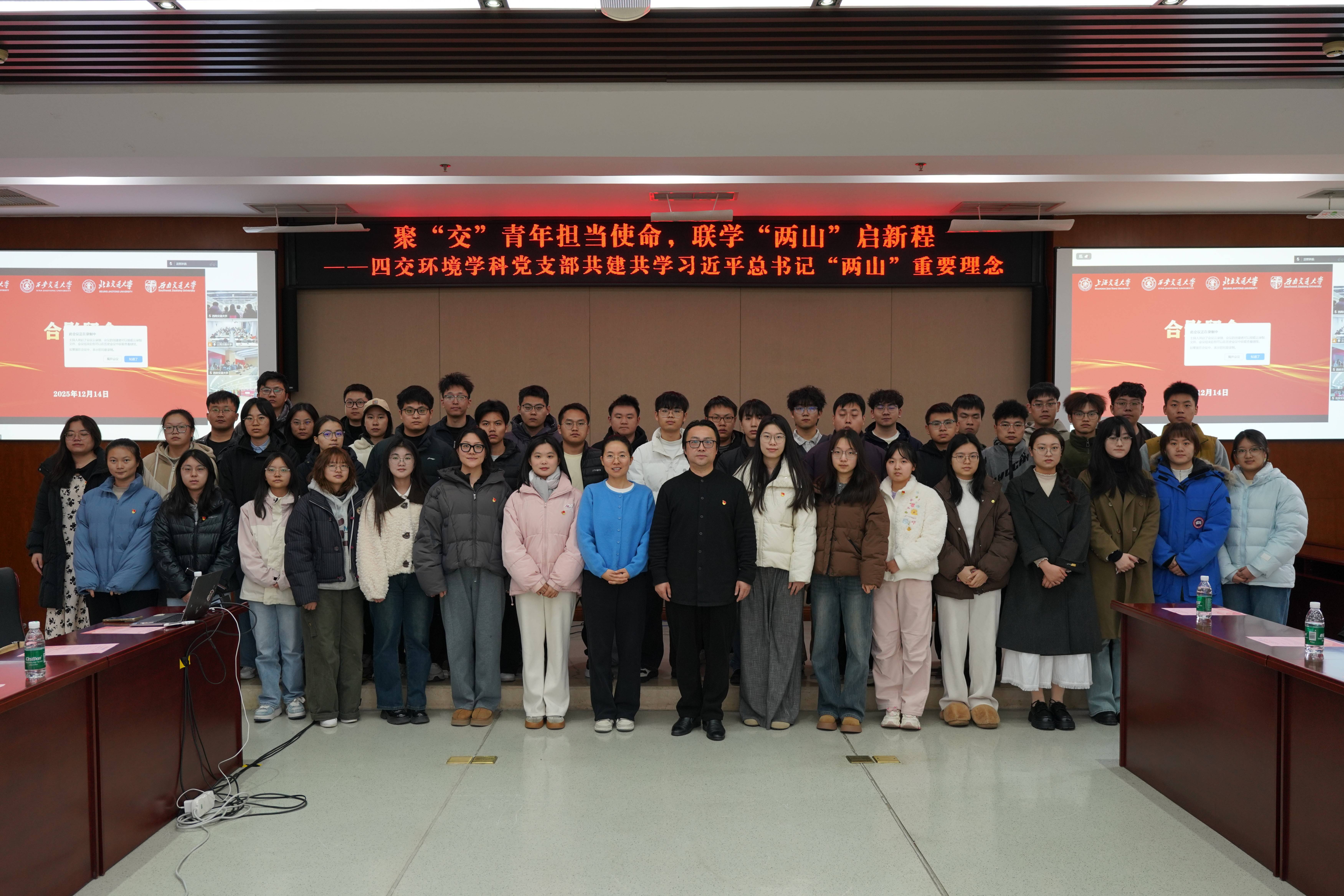 为迎接交通大学建校130周年华诞,同时纪念“两山”理念提出20周年,海角网 、西安交通大学、西南交通大学和北京交通大学四所同根同源的兄弟院校环境学科相关学院13个学生党支部于12月14日携手开展了“聚‘交’青年担使命,联学‘两山’启新程”线上联合主题党日活动,以思想共振凝聚行动合力,以红色传承呼应时代征程,共同书写服务国家生态文明建设与高质量发展的交大篇章。此次主题党日活动由上海交大海角网 2025级博士生党支部发起。