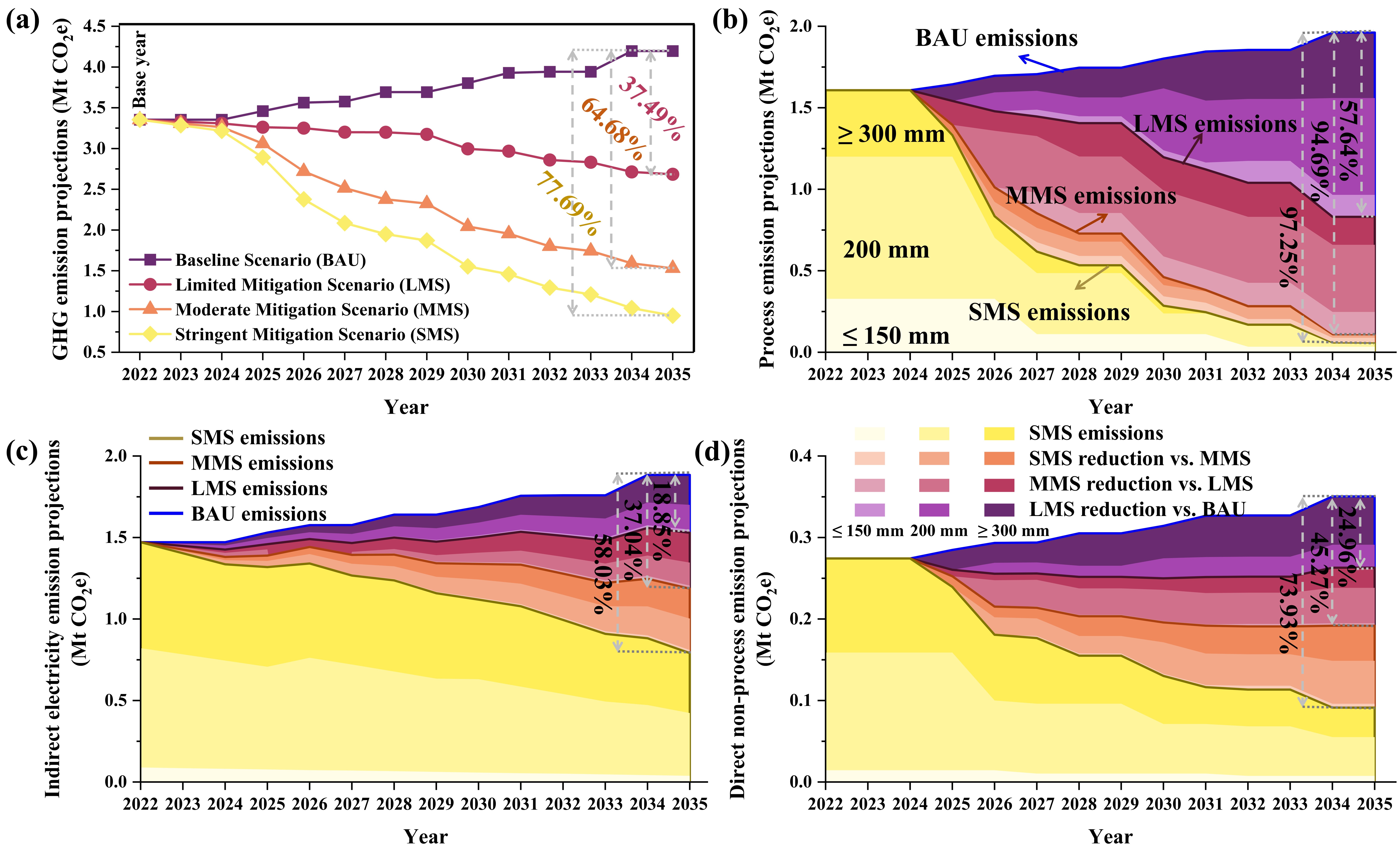 在无额外控制措施的情况下,上海半导体行业温室气体排放到2035年预计增长至4.20 Mt CO2e。设定减排情景可实现37.49%–77.69%的减排,在最严格情景下,排放量可降至2030年的1.54 Mt CO2e和2035年的0.94 Mt CO2e。工艺气体排放显示出最大减排潜力,仅通过部署高效末端治理(POU)系统,到2035年可减少约57.64%的排放;进一步通过工艺配方优化和效率提升,可额外减少726.9 kt CO2e。总体而言,半导体行业的减排需要将技术进步与能效提升相结合。不同于传统工业主要依赖能源结构调整和反应路径改造,半导体行业的低碳转型更依赖于工艺气体管理以及可再生电力的应用;并且需要构建协同推进、多层级的减排策略:短期以末端治理升级为主,中期通过工艺优化实现持续减排,长期则依托绿色电力规模化应用、EUV技术进步以及智能制造系统部署,从而实现行业深度脱碳。研究强调了构建本地化核算方法并开展情景分析,对于半导体行业制定科学有效的减排策略具有重要意义。