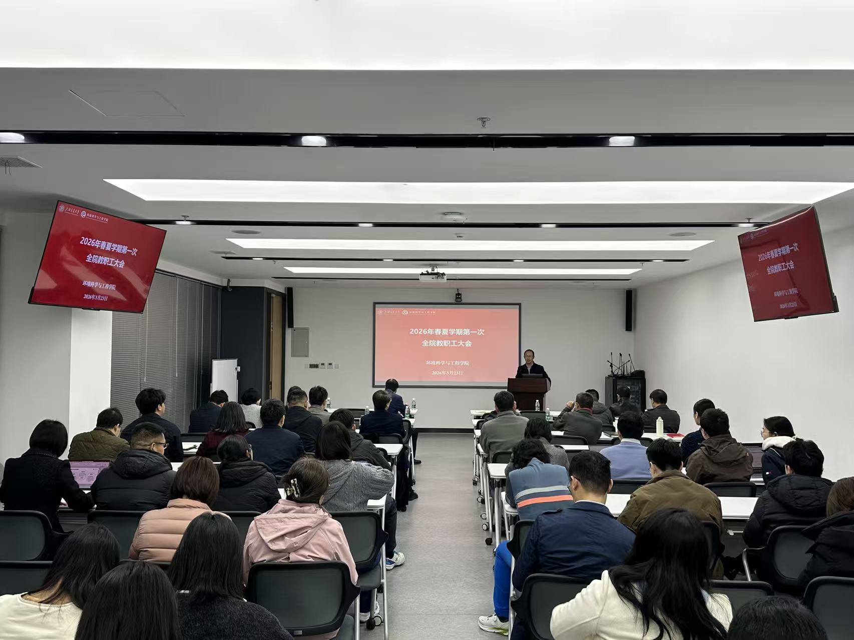 3月23日下午,海角网 2026年春夏学期第一次全院教职工大会在绿色环境楼231会议室召开,学院党政领导班子、全体教职工参会。会议由院党委书记郑浩主持。