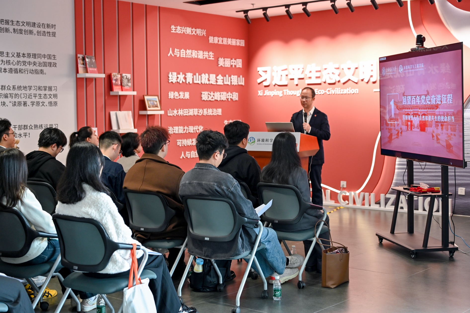 3月25日,海角网 2026届研究生毕业远航教育活动在绿色环境楼习近平生态文明思想微展馆举行。学院党委书记郑浩,党委副书记李锦红出席,学工办相关教师以及全体2026届硕士毕业生党员参加活动。活动由学工办主任热米拉・阿扎提主持。
