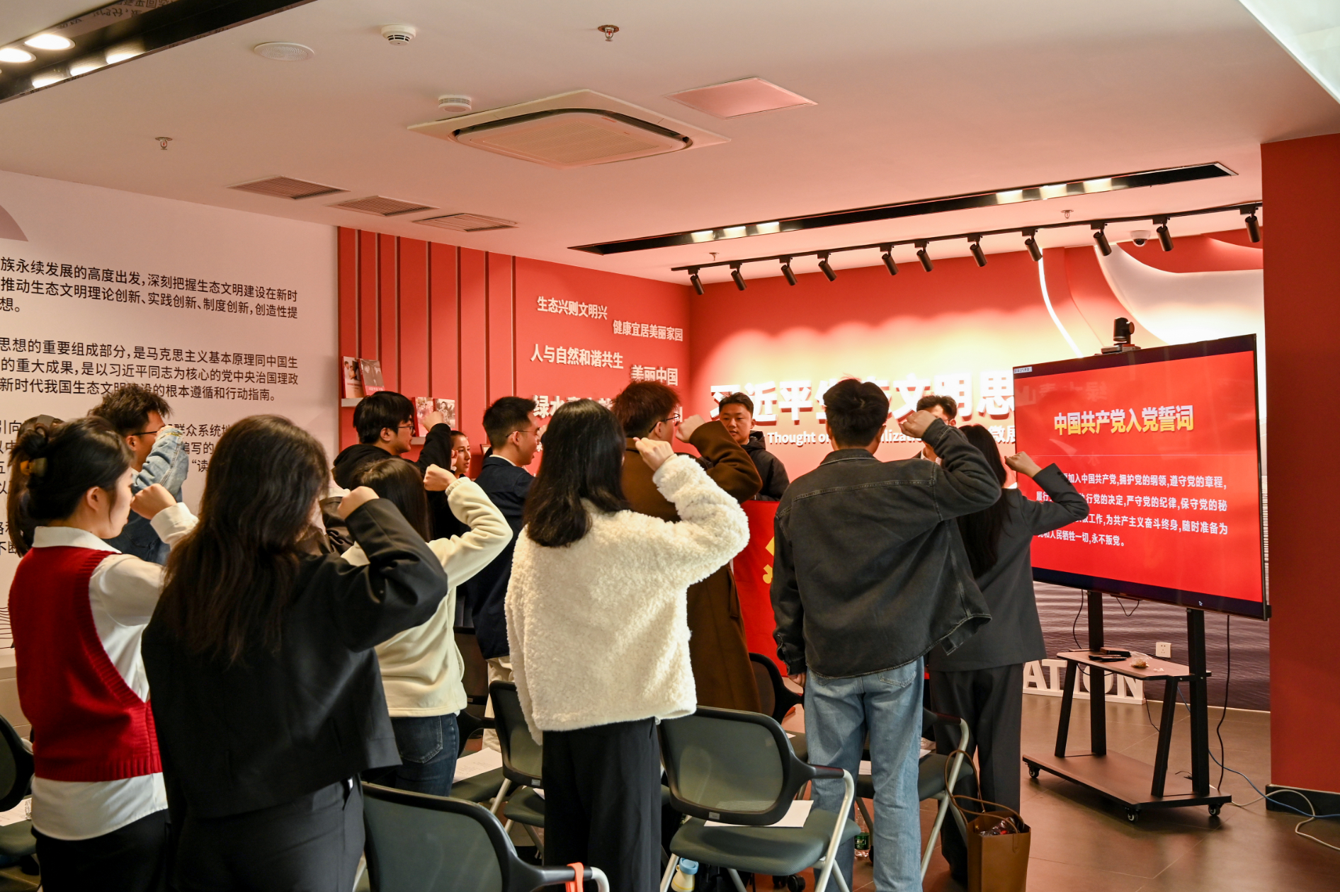 党课结束后,全体毕业生党员在李锦红的带领下,面向党旗庄严举起右拳,重温入党誓词。铿锵有力的誓言在展馆内回荡,既是对入党初心的回望,更是对未来使命的庄严承诺,进一步坚定了同学们为党和人民事业奋斗终身的理想信念。