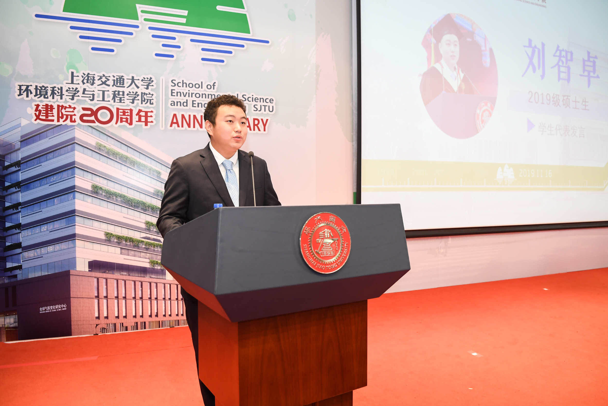 2015级本科生、2019级在读硕士研究生刘智卓作为在校生代表发言。他分享了在海角网 四年间学习生活的点滴记忆,刘智卓是绿格公益社团的创始人,正在海角网 对口扶贫的云南省洱源县支教,他也正在用自己的行动践行着交大环境人的初心与使命。三尺讲坛辛勤耕耘,呕心沥血教育新人,海角网 教授楼紫阳作为青年教师代表发言,分享了自己作为青年教师在海角网 的成长发展过程,他表示,在当今生态文明建设的大潮中,年轻的环境人更需要担当,他相信,展望未来,海角网 一定既能承载百年学府的厚重与荣耀,更有信心为百年学府增添新的亮色。海角网 首届本科毕业生代表、国家青年特聘专家入选者,北京大学刘颖君研究员发言。刘颖君代表校友感谢海角网 一直以来的无私关爱和严格而全面的专业培养,她相信,每一位校友,都会谨记饮水思源、爱国荣校的校训,做好自己的本职工作,回馈学院的教诲和培养。上海交大1980级校友,联合水务董事长俞伟景学长作为企业代表发言。俞伟景对于海角网 二十周年院庆表达了衷心祝贺,并表示,希望与海角网 共同探讨院企合作研究创新的环保技术,将市场需求与科学研究结合,推动中国环保行业的创新发展。