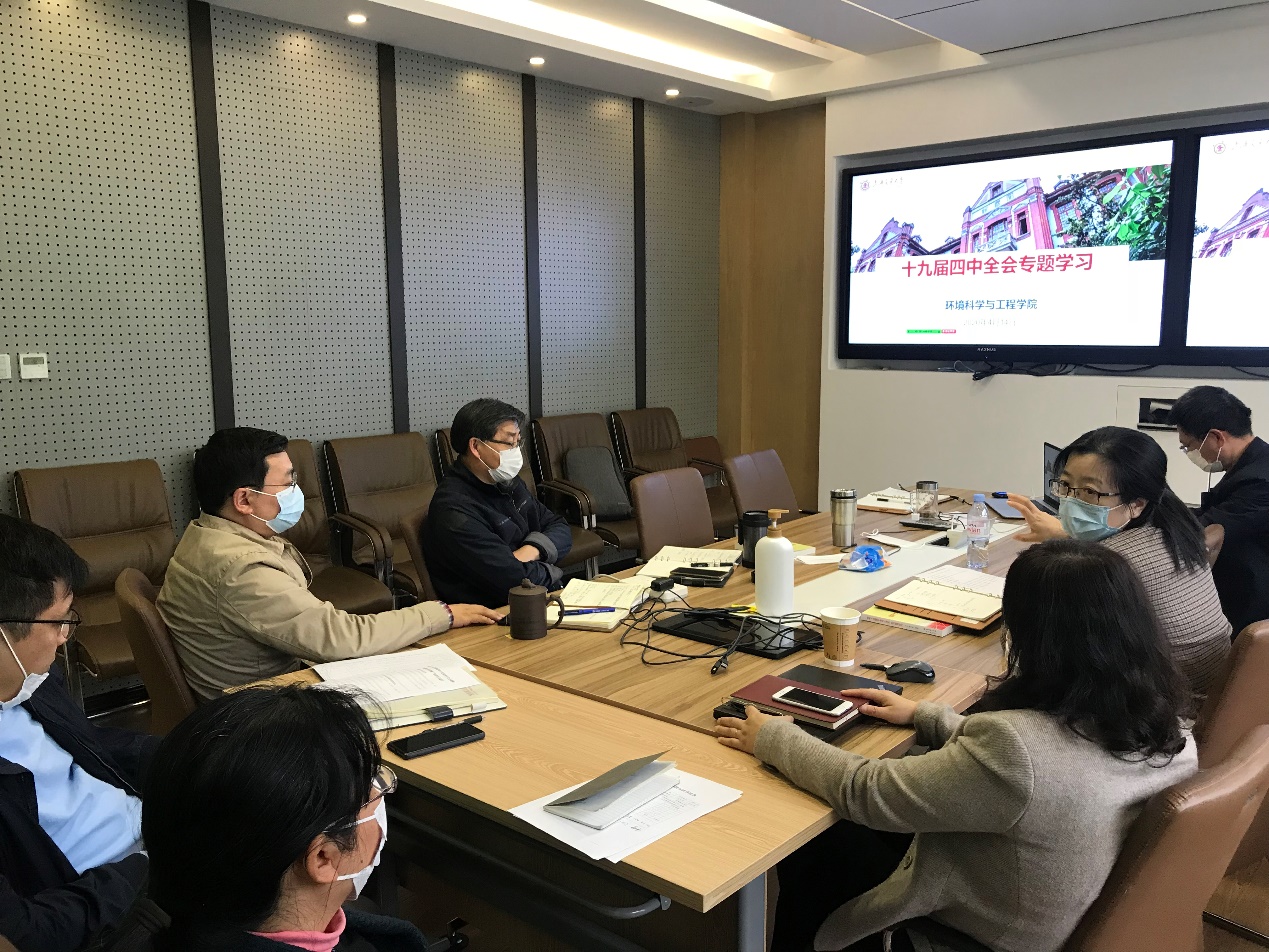 领导班子成员在环境楼212会议室召开十九届四中全会精神专题学习会议。副院长许振明、曹心德、刘萍,副书记陈哲、工会主席何圣兵、院长助理李亚红、赵一新等参加了会议,会议由学院党委书记胡薇薇主持。