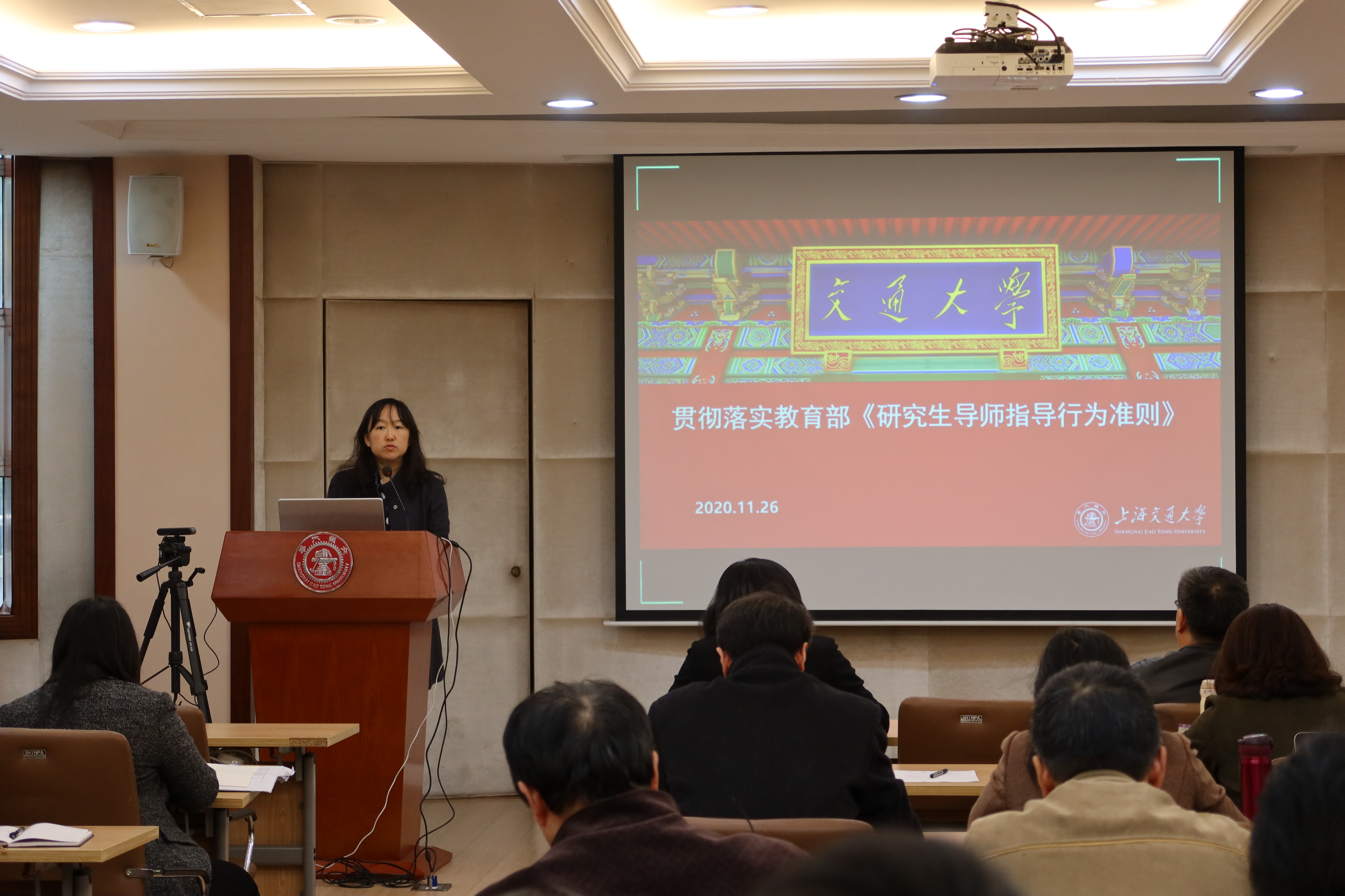 副院长刘萍就教育部近期下发文件进行宣讲。11月4日,教育部下发《研究生导师指导行为准则》,该准则是研究生导师指导行为的基本规范,刘萍向与会教职员工详细解读了作为研究生导师的“八条十不得”。刘萍强调,学院将根据文件精神,进一步强化监督指导,将准则真正贯彻落实到研究生招生培养全方位、全过程,并强化岗位聘任、评奖评优、绩效考核等环节的审核把关。