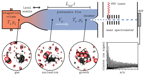 气相成核是指气相分子相互结合,生成可以自发生长分子团簇的过程。这一过程不但是大气中新粒子的来源,也广泛存在于各种工业生产过程中。理解成核过程对分析大气中颗粒物的气候与健康效应,优化工业生产过程有重要意义。以往研究发现,在单一物种成核体系中加入另一种高挥发性的物种,可以极大地提高成核速率。阐释这一现象的机理需要对成核过程中生成的分子团簇进行定量测量。在以往研究中,定量测量集中相互作用较强的物质(如空气中的痕量硫酸与碱性分子),而并没有涉及弱相互作用的物质(例如非极性分子与碳氢化合物)。这是由于弱相互作用的物质形成的分子团簇极为脆弱,在实验上定量测量这些团簇的组成与浓度极为困难。面对这一挑战,李晨曦与Ruth Signorell教授课题组在研究中独特地结合了拉瓦尔喷管,真空紫外光电离与飞行时间质谱仪,最大限度地保存了分子团簇的完整性,使定量的动力学分析成为可能。该研究中所使用的实验装置示意图如图1所示。