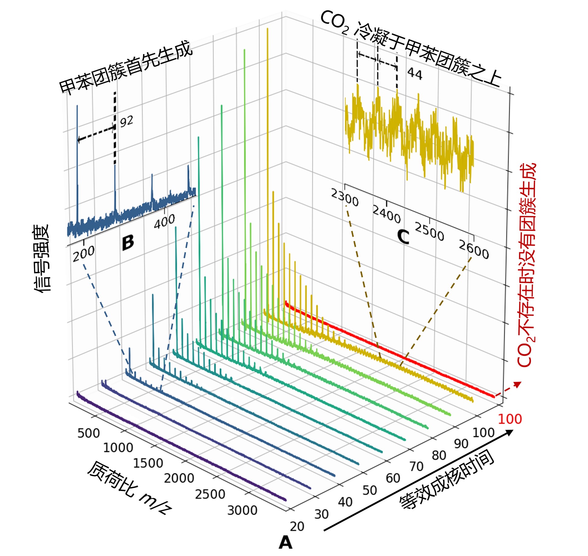 理解CO2的相变过程对碳存储技术开发、阐释火星大气的气象过程有重要意义。鉴于CO2的重要性,李晨曦助理教授利用上述实验装置,在研究中选取了CO2作为成核物种之一,研究了其与甲苯、水、正丁烷、正己烷及丙醇在成核过程中的互动。研究发现,CO2 在本质上起到了催化剂的作用,与其它分子形成过渡性的分子团簇,通过伴侣机制(chaperone mechanism)极大地加速了成核过程。甲苯在CO2存在时生成分子团簇的质谱图如图2所示。由图2可知,在成核过程中首先生成的分子团簇是纯甲苯团簇,然后这些分子团簇再通过CO2的凝结继续生长。