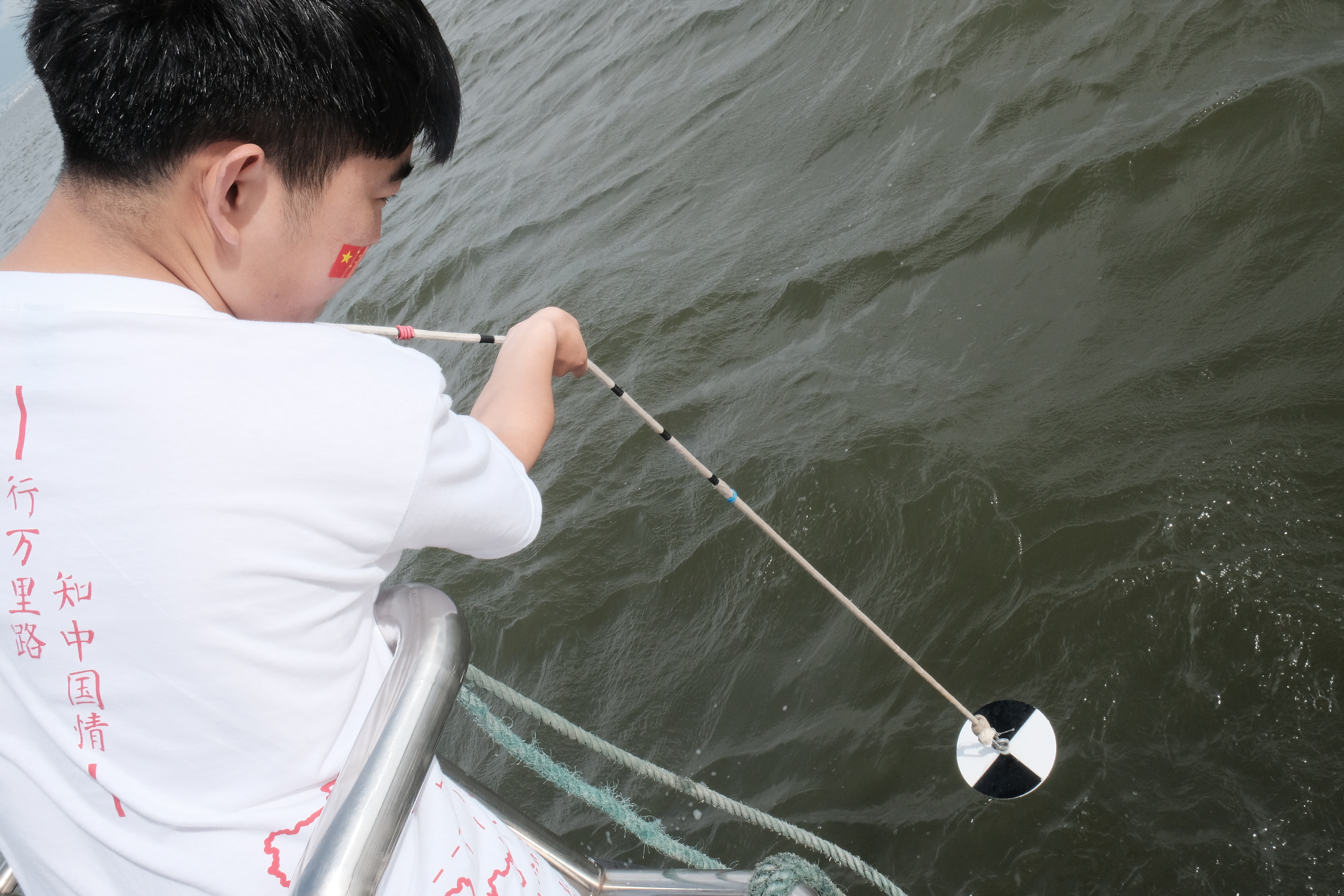 团队成员们向专业采样人员学习采样技术,在科研人员的指导下,利用自己的专业知识,理论与实践相结合,跟随着船只的节奏进行采样并在船上完成部分指标的检测。每个取样点分别取上层水和下层水,在现场进行了水温、浊度、pH、DO、藻类丰富度以及大气压等的检测,整个采样过程持续了3个多小时。