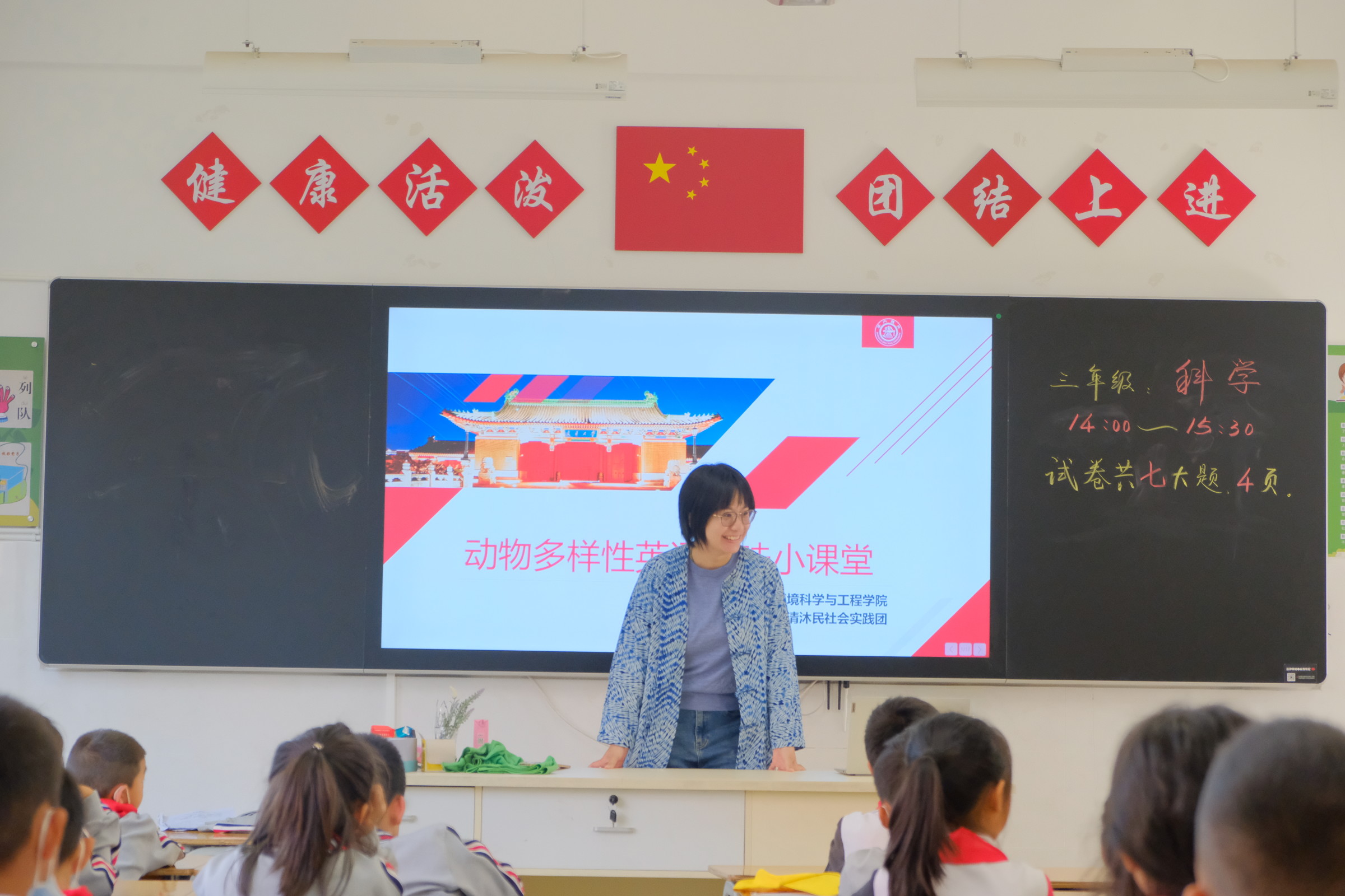9:00支教活动正式开始,首先由实践团指导老师张蓉进行动物多样性英语课堂,小朋友们通过学习动物的分类与其代表动物的英文单词,对动物的多样性有了简单的了解。课堂上的你画我猜小游戏,寓教于乐,加深对英文单词的掌握。