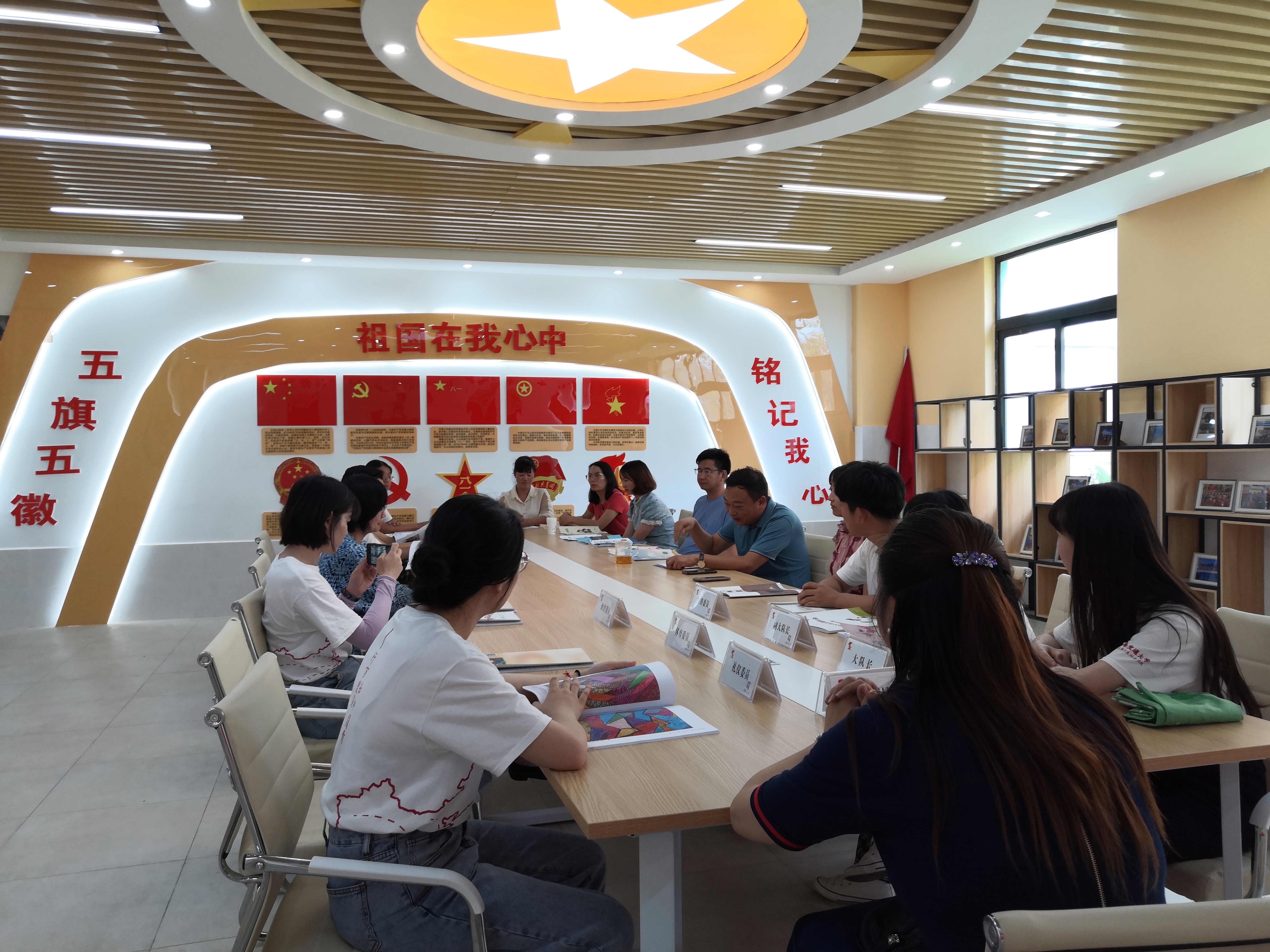 一天的支教工作结束后,满江小学校长赵浩伦邀请实践团进行交流。赵浩伦高度赞扬了实践团一天的支教工作。他表示,从孩子们脸上洋溢的笑容能看出大家今天很开心,希望实践团可以经常来。随后,他介绍了满江小学强化素质教育的理念,展示了学校的特色活动、校刊等相关内容。张蓉向赵校长等做学校、学院、学生实践团背景、目的等相关情况介绍。双方就德育教育等相关教育问题进行交流探讨。
