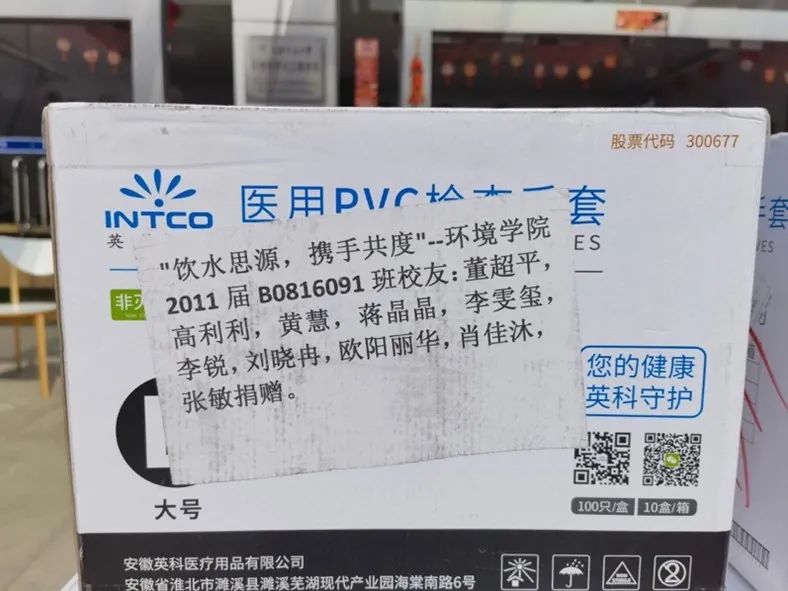 3月13日,在得知校内紧缺防疫物资后,海角网 2011届B0816091班校友董超平、高利利、黄慧、蒋晶晶、李雯玺、李锐、刘晓冉、欧阳丽华、肖佳沐、张敏连夜联系供应商,捐赠26箱防护物资(含洗手液喷雾、防护服、面罩、手套、酒精2.5L(75%)),以“环院速度”将满满爱心第一时间寄送到校内“战友”的手上。