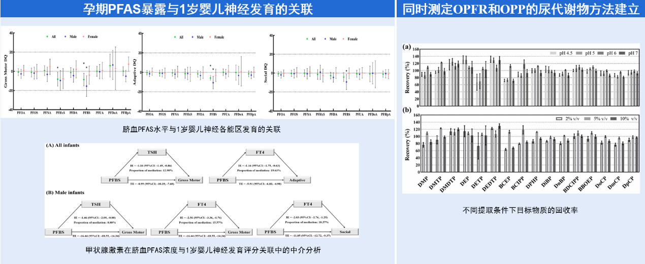 环境中新污染物对人类健康产生潜在不良影响,本重点实验室建立同时测定尿液中有机磷阻燃剂和有机磷农药的检测方法;评估孕期全氟化合物暴露对婴儿神经发育的影响及甲状腺激素的潜在中介作用,为评价新污染物的环境健康风险提供科学依据。