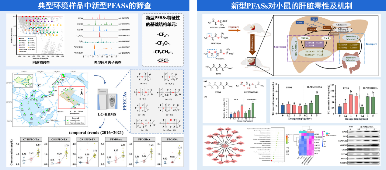 随着传统全氟化合物(PFOA和PFOS)的限用/禁用,大量新型PFAS作为替代品被开发、使用并排放至环境,进而进入人体,危害健康。本重点实验室构建新型PFASs非靶向/痕量靶向分析方法,实现复杂环境介质中未知PFASs的筛查识别和痕量检测,同时开展动物暴露实验,明确典型PFASs对小鼠毒性效应和毒性机制,为其风险评价提供重要科学依据。